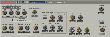 As with the analogue model a simple sine wave oscillator drives the lips module and the tube resonator which has to be in tune or a harmonic relation for it to work. In Reaktor tuning is in midi notation so to change by an octave that’s = or - 12. “Severity” is how much the lips affects the harmonic generation round the tube circuit. “Tube res” is how live or echoey the tube is. “Satlevel” and “Satfeed” control how the the resonance is stopped from taking off and overloading everything. Far right the button switches in the glissandi demo. Press a keyboard key and turn the knob.