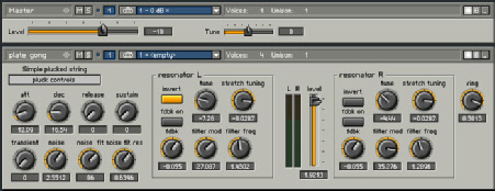 Shown above, you can see the 3 main sections: pick, string resonator and simple body resonator. “Transient” provides the kick on releasing the ‘string’. “Noise” is the noise content of the pick. The above controls set how soft or hard thick or thin it is. In the “string resonator” section, the filter is the low-pass string softening filter, “filt mod” tracks it to the note pitch. “Stretch tuning” compensates a little for the added delay of the filter which is fixed. “Transient bend” bends the string with the envelope of the pick controls.