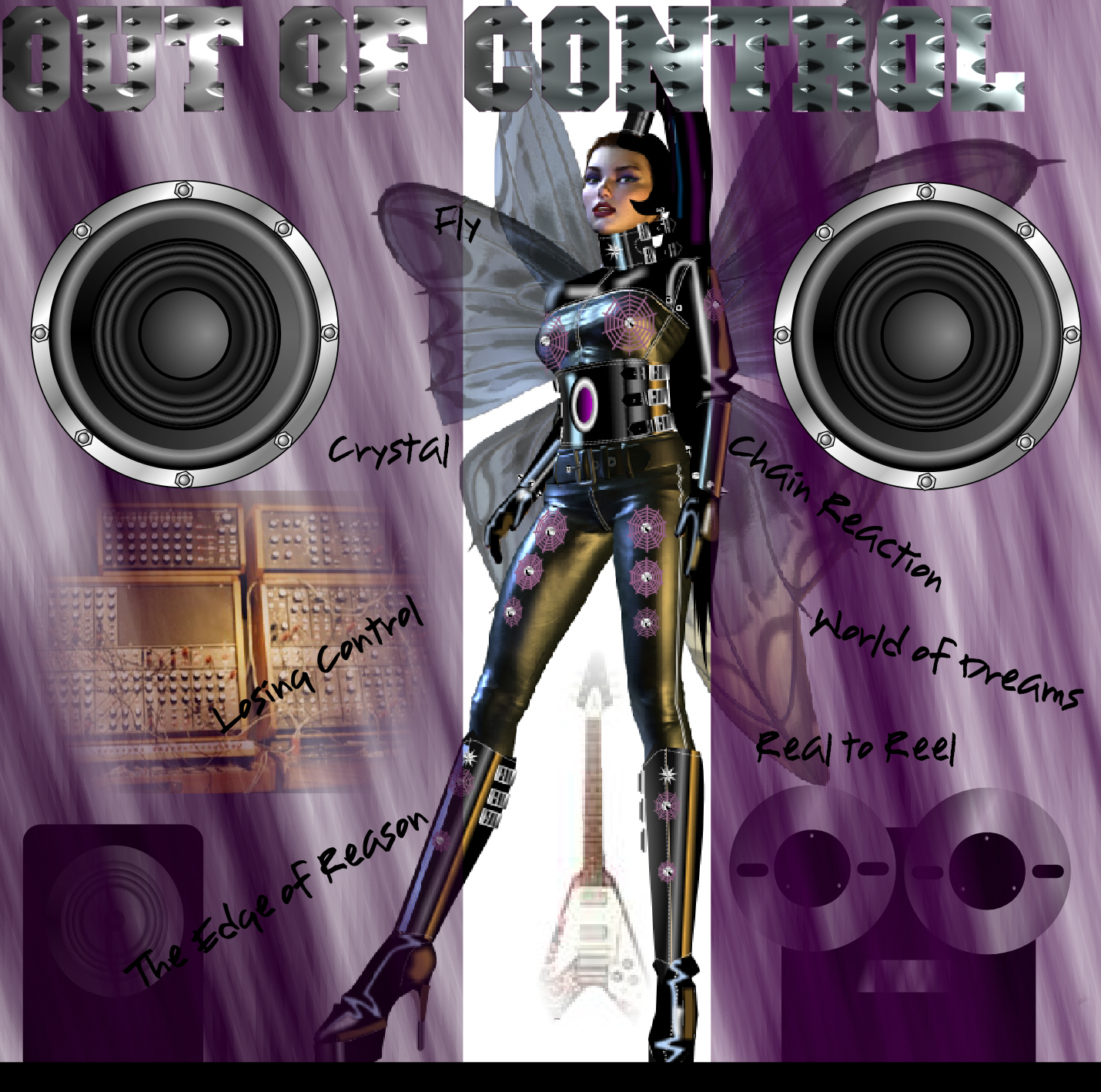 The poster... As this is not a CD release with no cover artwork initially, the web page space looked a bit bare so instead I put together this computer generated fantasy image poster on the theme of control, our gear, music, and my own impressions of a few of Phil’s lyrics. There’s a high-res version on the link. I got the idea from a nice paint job on the local rock pub’s van! keeping the heavy rock imagery of speakers, guitars etc. on it I cheekily substituted the usual winged skulls with a (naturally) computer generated winged bad fairy instead, I suppose posing the question is she ‘out of control’ or ‘in control’?