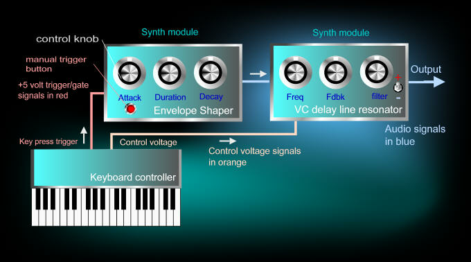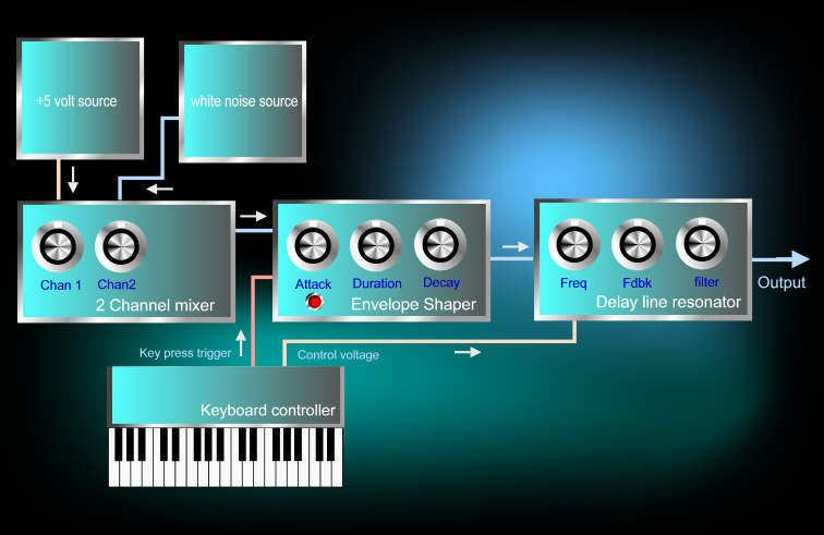 First the sound of a pick is needed. White noise and a fixed voltage source are fed into a mixer module and then into an envelope shaper. The controls are adjusted to produce a very short burst of noise; (all frequencies) along with a transient voltage step (kick). This is a very simple model of the sound energy produced the moment you pick the string. (The shorter the noise burst the ‘thinner’ the pick). This pick energy is fed into the delay line module .